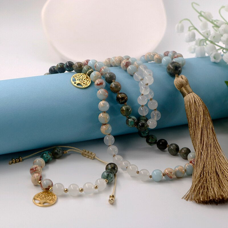"LEVENSBOOM" AFRIKAANSE TURKOOIS WITTE JADE & SHOUSHAN MALA SET