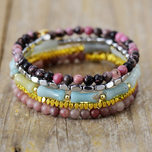 Een prachtig gelaagd accessoire dat als ketting of armband gebruikt kan worden om elke outfit meer dimensie te geven. Samengesteld uit een reeks natuurlijke edelstenen, waaronder de verzorgende Jaspis, de hoopvolle Amazoniet en de meelevende Rhodoniet.