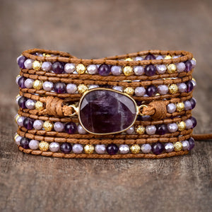 Maak kennis met onze betoverende Amethist armband, een betoverend meesterwerk dat is ontworpen om je geest en stijl te verheffen. Deze met zorg vervaardigde armband heeft verschillende lagen die versierd zijn met een reeks betoverende edelstenen.