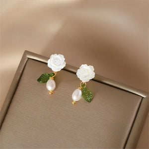 Dompel jezelf onder in de rust van onze Garden of Serenity pareloorbellen. Een delicate dans van de natuur ontvouwt zich als witte bloemen bloeien, versierd met sierlijke groene blaadjes en bekroond met glanzende zoetwaterparels en gouden accenten.