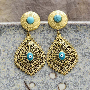 Een prachtig en uniek paar oorbellen dat pure luxe uitstraalt. Met ingewikkeld ontworpen patronen en het zachte en rustgevende Turkoois, een dromerige blauwe edelsteen die bekend staat om het bevorderen van sereniteit. Afgewerkt met het Boze Oog symbool, dat universeel bekend staat om slechte bedoelingen af te weren.