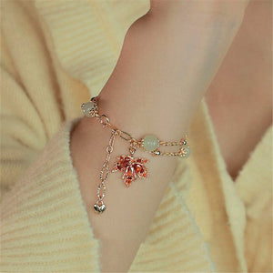 Een prachtige gouden armband bezaaid met zachtgroene Jade kralen en afgewerkt met een hanger van een esdoornblad, een symbool van liefde, kracht en uithoudingsvermogen in vele culturen.