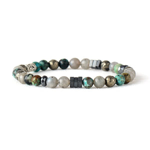Jaspis aardt je geest, Afrikaanse Turkoois stimuleert transformatie en Labradoriet wekt je intuïtie op. Deze armband is ontworpen om zowel je stijl als je innerlijke balans te verbeteren. Pyriet, met zijn stralende energie, weert negativiteit af, terwijl de zilveren accenten een verfijnde afwerking creëren.